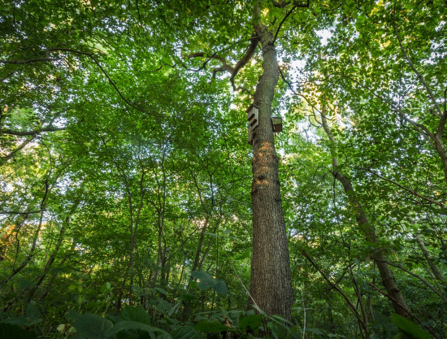 A few of the bat boxes of Ploughman Wood. They are installed three per tree to provide different aspects and temperatures