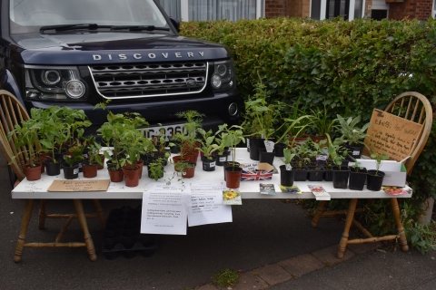 Jayne Bostock has been donating plants to Nottinghamshire Wildlife Trusts South Notts Local Group Spring Fair for the last 3 years and in the months leading up to the fair she had plants all over the place (last year she counted the plants, as a matter of interest, and there were over a hundred!). So when it became apparent, this year, that the fair would be cancelled, she had to think of some way to find homes for the plants and selling them for donations at the end of the drive seemed an obvious thing to do, as there were so many people passing by on their walks and with garden centres closed people were desperate for plants.