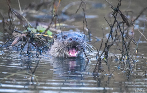 Otter swimming through water with branches and twigs nearby