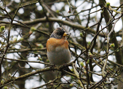 Bramblings are usually found in flocks, regularly joining up with chaffinches and other finches in places where plenty of food can be found. They're often found in woodlands, hedgerows and stubble fields, and will sometimes visit garden bird feeders.