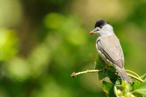 The blackcap is a medium-sized warbler, mostly found in woodland and tall scrub, but also in gardens, particularly during the winter. Blackcaps were once just summer visitors to the UK, but can now be seen all year-round as winter migrants from Germany and north-east Europe appear from September onwards. Blackcaps will feed on insects in summer and berries and fruit in winter. They nest in hedges or brambles and produce up to two clutches of four to six eggs a year.