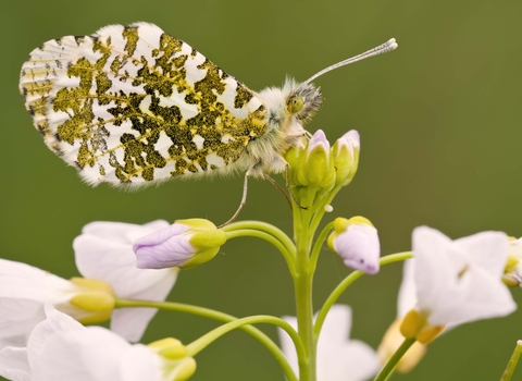 These pretty little butterflies are easy to spot as the males’ wings have bright orange tips – giving them their name! They are a common sight during spring and can be found in lots of places including meadows, woodland and hedges. The adults lay their eggs on special plants to ensure that their caterpillars have the right food to eat. Orange-tip caterpillars love garlic mustard, cuckooflower and hedge mustard plants.