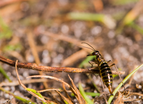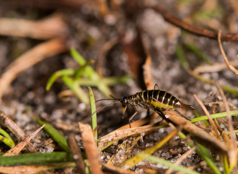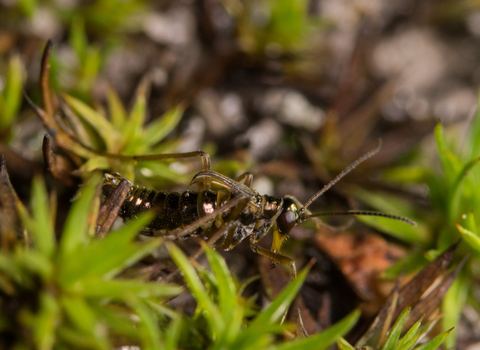 This flightless relative of the scorpionfly roams across clumps of moss in winter.