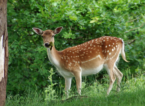 Fallow deer prefer deciduous or mixed woodland with large clearings, typically living in small herds. They are also common in many deer parks throughout the country. They eat grasses and herbs, and will browse young, broadleaf trees.